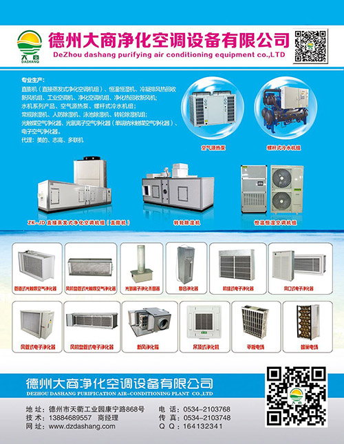 德州大商凈化空調設備有限公司是一家生產中央空調凈化空調設備及空氣凈化器的專業(yè)制造商。公司產品包括風冷屋頂式凈化空調機組、恒溫恒濕(凈化)空調機組 、單元式空氣調節(jié)機組 、冷凍除濕機組 、泳池除濕機組、風冷管道式空調機組、風冷直膨式凈化空調機組、工業(yè)除濕機組、風(水)冷柜機、 組合式空調機組、冷凝熱回收機組等一系列空調產品及中央空調末端配套使用的空氣凈化器,并可根據用戶需求設計制造各類非標產品。產品型號齊全,性能穩(wěn)定可靠,外形美觀大方,使用方便舒適。