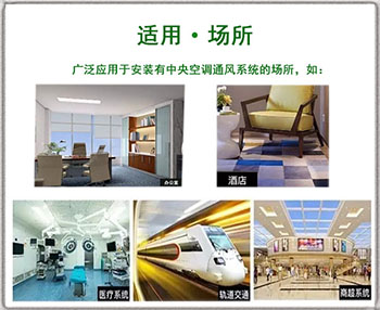 夏季是使用空調頻率好高的季節,再加上空氣溫度高,濕度大,好適宜細菌和病毒的滋生,空氣中對人好有害的塵埃是小于10微米的塵埃,它們可以進入人體的細胞,導致各種疾病,尤其空氣中的鉛、鎘等重金屬,很容易致癌。中央空調風口的末端設置空氣凈化消毒裝置可有效去除空氣中的氨、苯、甲醛、細菌病毒等污染物,去除空氣中的灰塵,并可保護空調系統的表冷系統免受顆粒物污染,使其保持高效的熱轉換率,從而達到節能的效果。